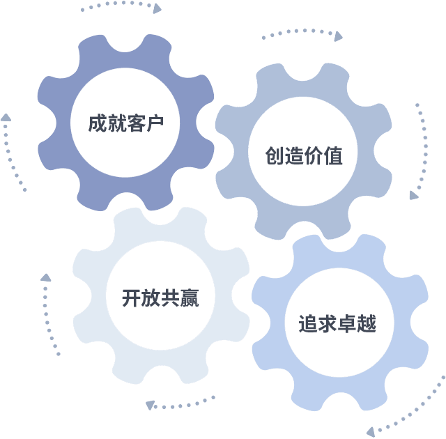 成就客户是一切决策的出发点,,,创造价值是衡量所有工作的标准,,,,追求卓越是我们做事做人的态度,,,开放共赢是我们的格局也是最终的结果。。。。价值观的齿轮环环相扣,,推动着组织里的每个人不断向前。。。